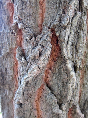 ∙ L’autre moitié des espèces ont une écorce rugueuse : l’écorce morte se dessèche mais reste sur l’arbre. Les couches s’entrelacent, s’emboîtent, se sillonnent différemment selon les espèces. Chez certaines, la résine se mêle à l’écorce rugueuse et en séchant forme une écorce d’iron bark.
